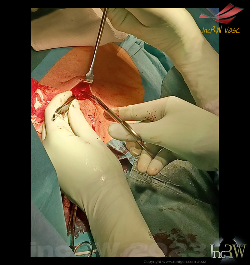 När den tunnelerande staven kommit ut genom punktionsstället på halsen fästes den ännu utanpåliggande kateteränden (peang klampad ände) på den tunnelerande stavens ände.