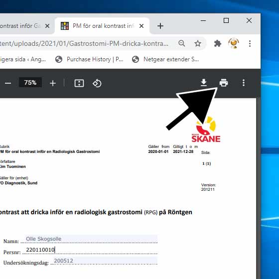 Följ sedan nytt fönsters symboler för utskrift eller att spara ner PDF-filen på annan dator. Hur ny flik/fönster för utskrift ser ut skiljer sig mellan Windows eller annat operativsystem samt vilken webbläsare du använder.
