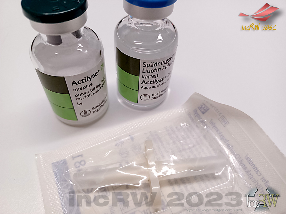 - Patienten ska ha en introducer (för NaCl) som är minst 1F större än vald trombolyskateter (för Actilysinfusion).